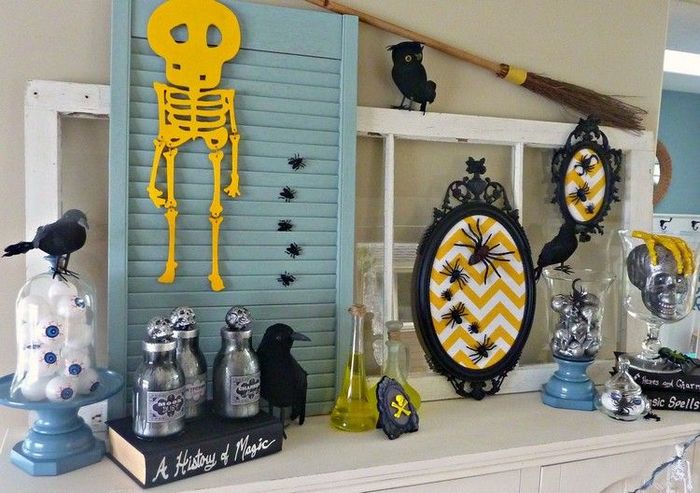 Старые рамы для картин, стекло которых нечаянно разбилось, вполне подойдут в качестве дешевого, но великолепного украшения полок, подоконников или пространства над камином. Раскрасьте их только в черный цвет и применяйте только рамку без фона. Бумажные летучие грызуны летают во все стороны и украшают ваши окна на Хэллоуин. Вырежьте летучих мышей из черной бумаги различного размера и приклейте их на окна..