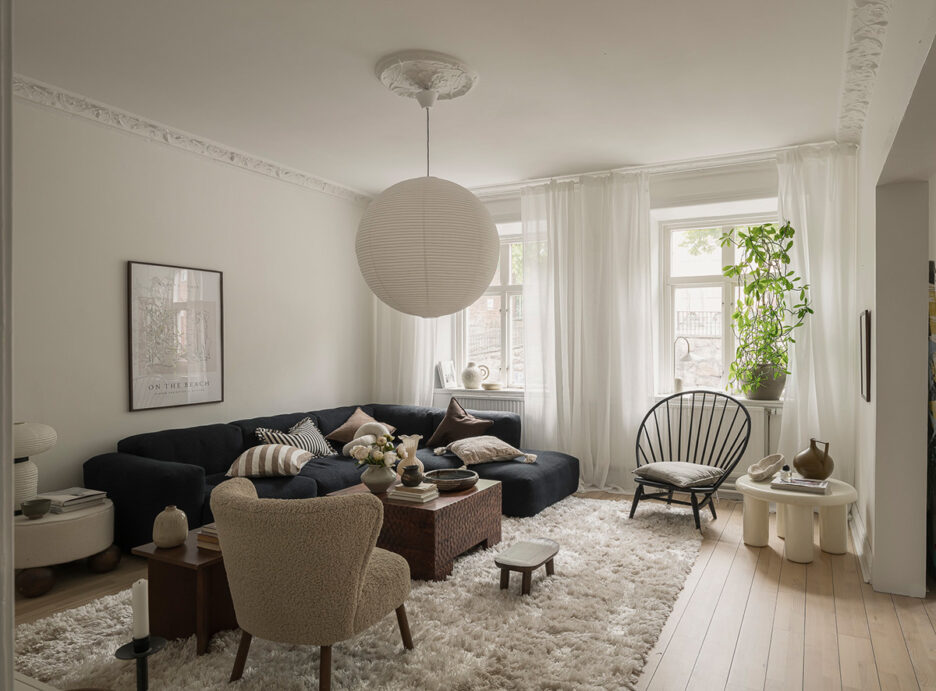 Сегодня у нас прекрасный белый интерьер в Швеции, в каждой комнате которого есть несколько контрастных тёмных акцентов. В гостиной это современный диван в углу — он здесь словно укромный островок посреди воздушно-белой основы комнаты. В обеденной мы можем видеть большую абстрактную картину в черном на стене, а на кухне — столешница и посуда. В спальной тёмных акцентов совсем мало — лишь пару подушек и круглое зеркало в металлической раме. В целом получился приятный и уютный современный скандинавский интерьер!