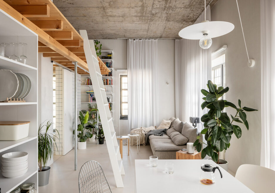 У этой квартиры в Словакии довольно свободное зонирование — комнаты плавно переходят одна в другую, а границы между функциональными зонами часто размыты. С первого взгляда пространство похоже на лабиринт, в котором не так легко и сориентироваться, но интересно разгадывать. Интерьер имеет четко выраженный индустриальный характер: бетонный потолок, деревянные перекрытия, открытая планировка. Отличный пример современного взгляда на практичный интерьер!
