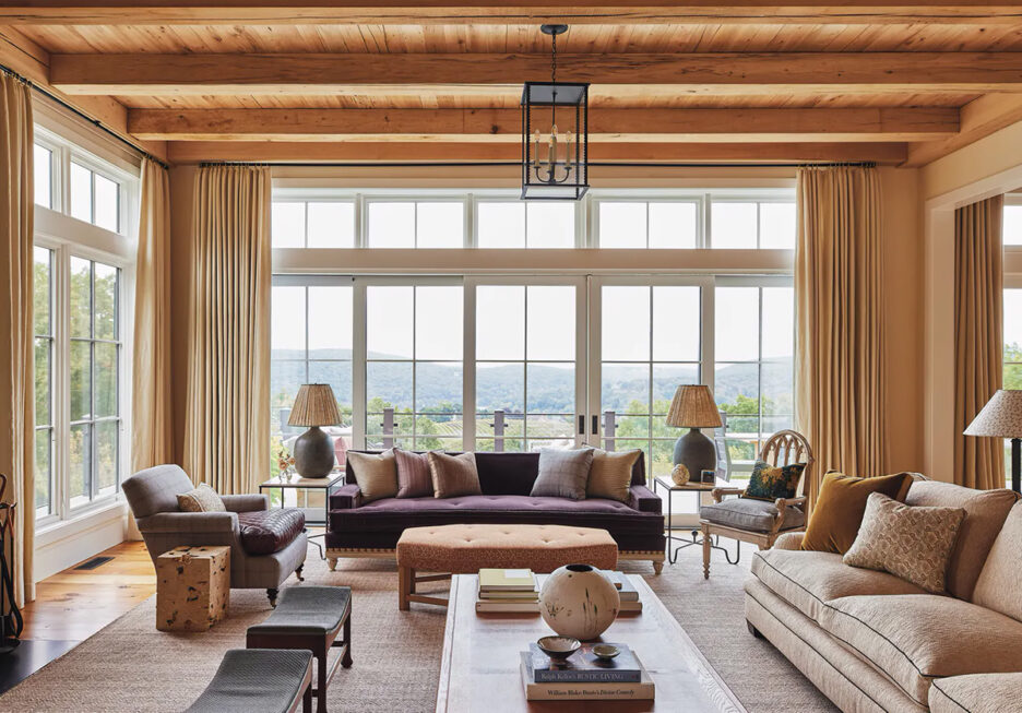 Говоря об этом просторном доме в Коннектикуте, важно начать с его невероятного расположения на вершине холма, откуда открываются виды на все 360 градусов. Поскольку в хорошем дизайне внешняя среда всегда задаёт том и является главным источников вдохновения, архитекторы спроектировали дом таким образом, чтобы взять максимум из локации. Так, окна на всю стену в гостиной стали словно огромным экраном в кинотеатре, на котором в режиме нон-стоп демонстрируются лучше в мире фильмы про природу. В целом же это очень приятный и спокойный загородный интерьер в светлых натуральных тонах. Enjoy!