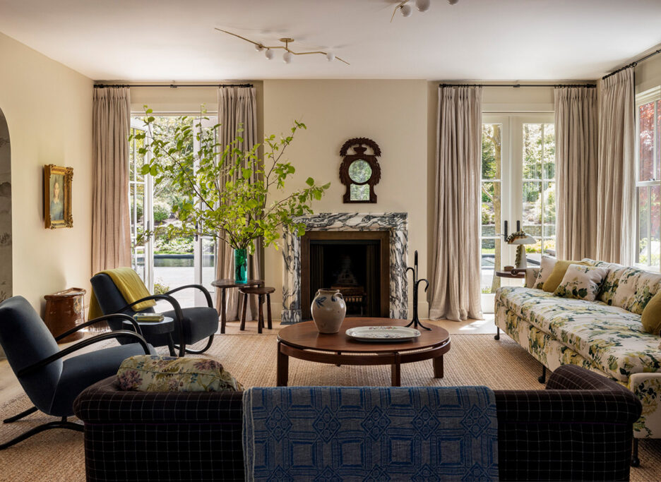 Буквально в каждой комнате этого деревянного коттеджа на Лонг-Айленде можно отыскать либо изображения растений на стенах, либо цветочные узоры в мебели и декоре. При этом дизайнер Heidi Caillier проявила много фантазии и выдумки, реализовывая эту идею в дизайне. Так, в гостиной диван имеет чудесную цветочную обивку, в обеденной — монохромные обои с деревьями, а в спальной над изголовьем и вовсе оригинальная творческая композиция на тему цветов. Давайте же рассмотрим этот прекрасный интерьер в деталях!