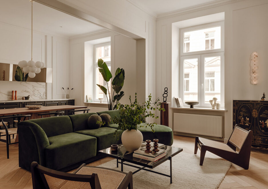 Этот элегантный интерьер в Кракове — результат объединения двух квартир в старинном доходном доме в историческом центре города. Молдинги на стенах и отсутствие штор прекрасно подчеркивают классическую красоту пространств, которые характеризуются высокими потолками и внушительными размерами комнат. А вот мебель и декор здесь в основном модных современных моделей, хотя парочка оригинальных ретро-предметов также присутствует. Изящно и стильно!