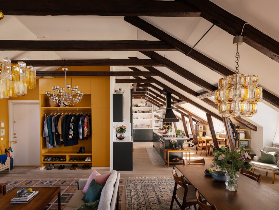 Интерьер этой мансардной квартиры в Стокгольме получился очень насыщенным и живым. Общее пространство гостиной, обеденной и кухни буквально усыпано декором и мелкими деталями на открытых полках. В стиле оформления чётко прослеживается влияние ретро — мебель, освещение, ковры, картины. Интерьер словно уносит нас на полвека назад в прошлое и дарит приятные нотки ностальгии. Enjoy!