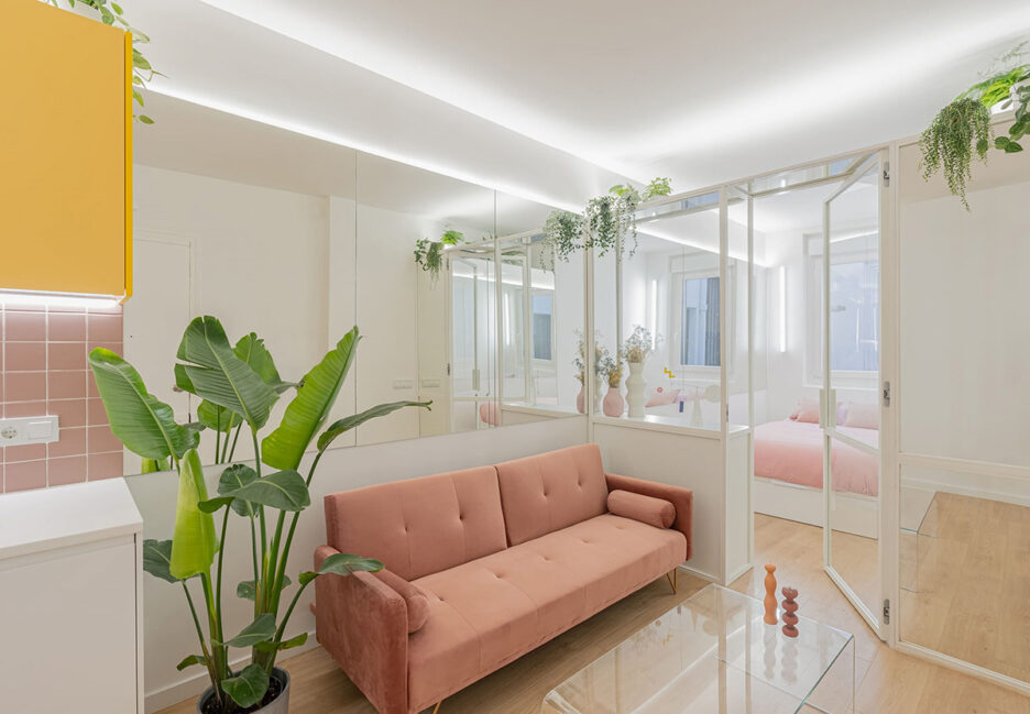 Площадь всего 28 кв. м, вытянутая планировка и небольшое количество естественного света — с такими исходными данными пришлось работать дизайнерам испанской студии Bardo, когда хозяева попросили их создать комфортное и стильное арендное жильё в центре Мадрида. В ход пошли белые стены, стеклянные перегородки и зеркала — таким образом удалось визуально увеличить пространство и усилить освещение. В качестве жизнерадостных штрихов выступили пастельные акценты розового и желтого, а также живые растения. Компактно и симпатично!