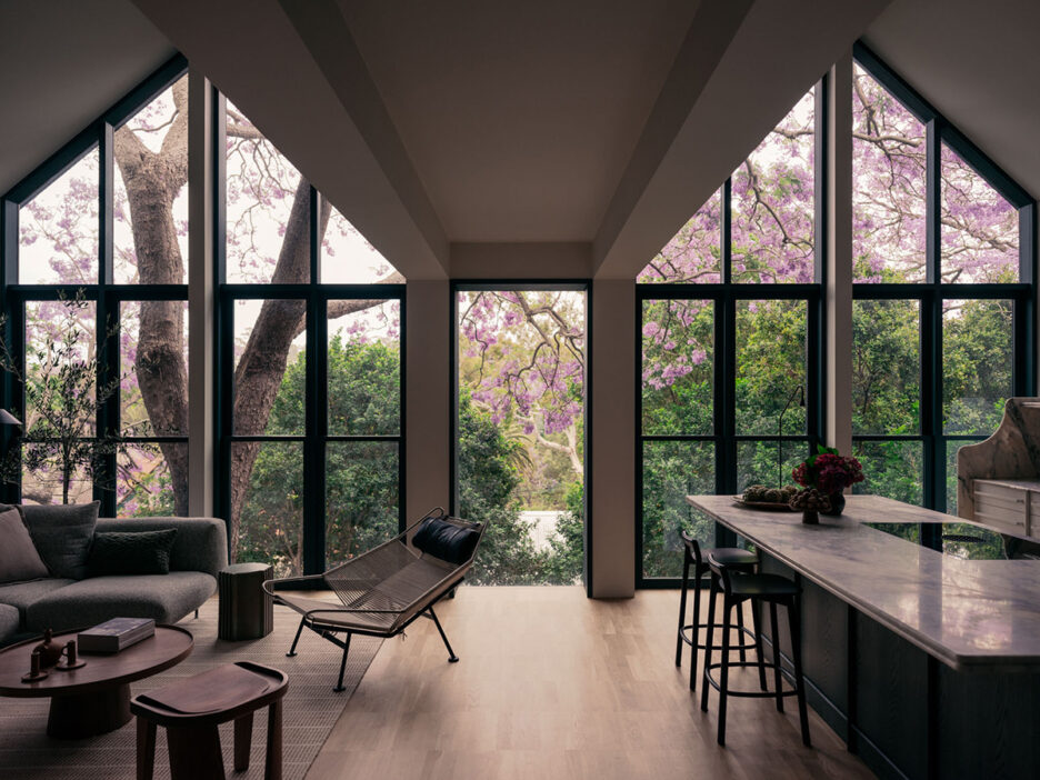 Этот коттедж в Сиднее получился очень необычным, с какой стороны не посмотри. Во-первых, архитектура — это современное прочтение амбарного стиля. Здесь мы видим знакомые формы и очертания экстерьера, но отделка фасада и обильное остекление делают дом стильным и оригинальным. Но главная фишка этого жилья — роскошное экзотическое дерево Жакаранда с красивым цветением, вид на которое создаёт удивительный эффект в интерьерах. Приятного просмотра!