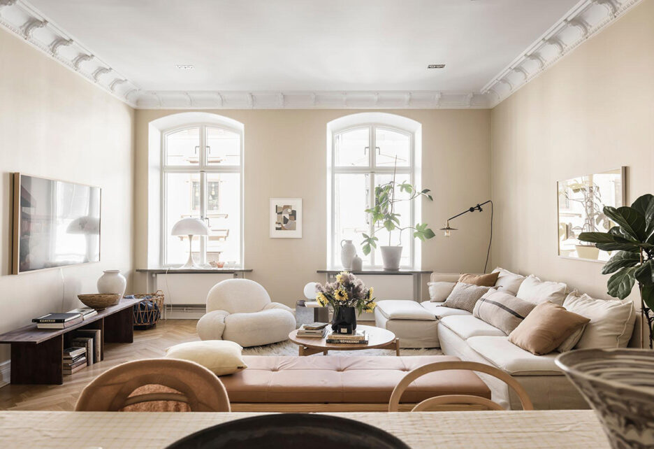 Просто гостиной этой квартиры в старом доме в Гётеборге вдохновляет. Это очень светлое и тёплое благодаря цветовой гамме помещение буквально излучает уют и гармонию. В этом интерьере дизайнеры спроектировали сразу две функциональные зоны — зона отдыха с мягкой мебелью и обеденная с большим столом на 6 персон. Белая кухня также купается в естественном свете и имеет выход на очаровательный балкон. Ну спальню с собственной гардеробной украшает акцентная синяя стена. Прекрасный скандинавский интерьер для беззаботной жизни!