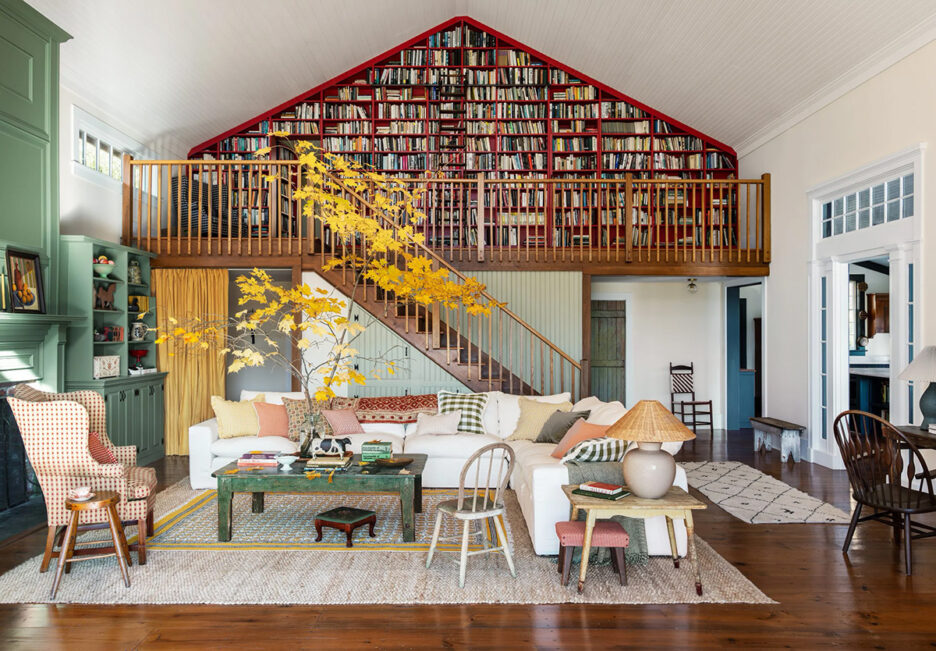 В целом обновлённый интерьер этого старого 100-летнего коттеджа в штате Нью-Йорка получился очень спокойным и расслабляющим — в духе кантри интерьеров американских загородных домов. Но есть здесь один wow-фактор — роскошная библиотека на антресоли в гостиной, которая делает интерьер очень эффектным и подчеркивает высоту пространства. Отличное гнёздышко для любителей подолгу посидеть в кресле с любимой книгой!