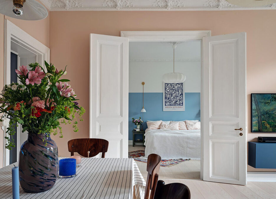 Интерьер этой квартиры в старом доме в Гётеборге построен на довольно неожиданном, но всем знакомом сочетании — пастельных оттенков розового и голубого. Если в гостиной стены покрашены в розовый цвет, то в спальной и на кухне можем видеть уже доминирование голубого. В целом каждая комната получилась довольно красочной разной степенью интенсивности гаммі и акцентов. Приятного вдохновения!