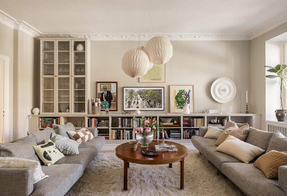 Серый и бежевый — два самых любимых цвета скандинавских дизайнеров, и в этой квартире в Гётеборге мы можем видеть микс обоих. Без ярких деталей в декоре такой нейтральный интерьер был бы довольно скучным, но в качестве оживляющих акцентов здесь выступают… книги! Практически в каждой комнате есть полочки, где хранится литература хозяев — даже в коридоре. Ну и парочка настенных постеров здесь также имеется. Enjoy!