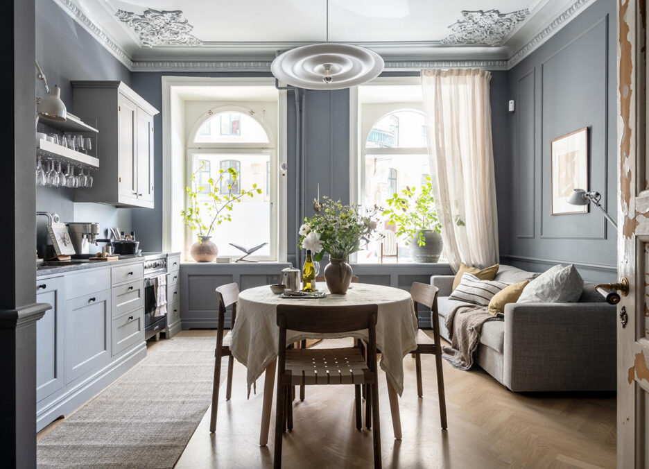 В этой шведской квартире-студии площадью всего 34 кв. м видна рука дизайнера. Здесь вы не найдёте спокойный светлых стен и решений по визуальному увеличению пространство, которые обычно можно встретить в небольших интерьерах. Зато есть смелые тёмные краски в оформлении, элегантный настенный декор и стильные тёплые детали, добавляющие уюта. Стоит отметить, что спальня здесь спрятана в нише без окон, но не отделена от главного пространства дверью. Смело и интересно!