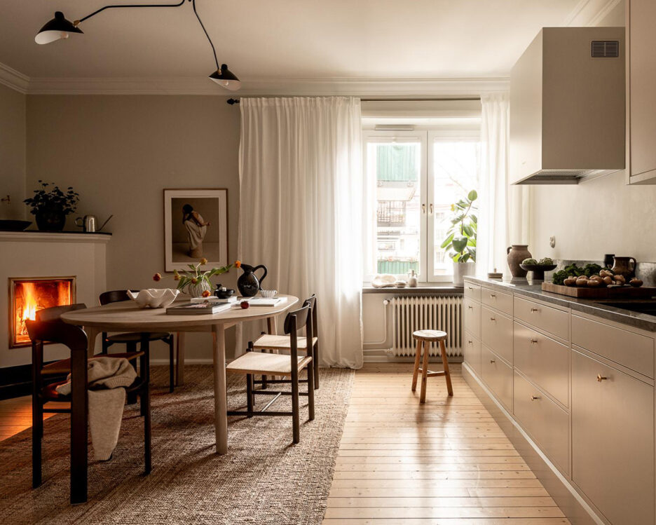 Рассказ об этой приятной квартире в Гетеборге стоит начать с кухни, ведь здесь сохранился оригинальный камин в углу — дом был построен ещё в 1920-х годах. Только представьте как хорошо здесь вечером, когда вся семья собирается за столом под звуки трескающихся дров! В целом интерьер получился спокойным и лаконичным, но довольно утончённым и с небольшим акцентом на приятные тёплые оттенки. Enjoy!