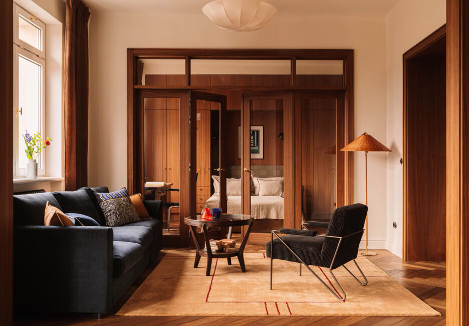 В современных интерьерах этой квартиры в доме 1930-х годов в Варшаве мы можем видеть много деревянных элементов декора: панели, корпусная мебель, обрамление дверей. Но это не грубое рустикальное дерево или привычный дуб, а необычный вид тикового дерева в тёмном оттенке. Благодаря этому выбору, интерьер квартиры смотрится современного и элегантно, в то же время есть отсылка к модернистскому прошлому здания. Сглаженные углы и интересная мебель в стиле mid-century прекрасно дополняют образ. Enjoy!