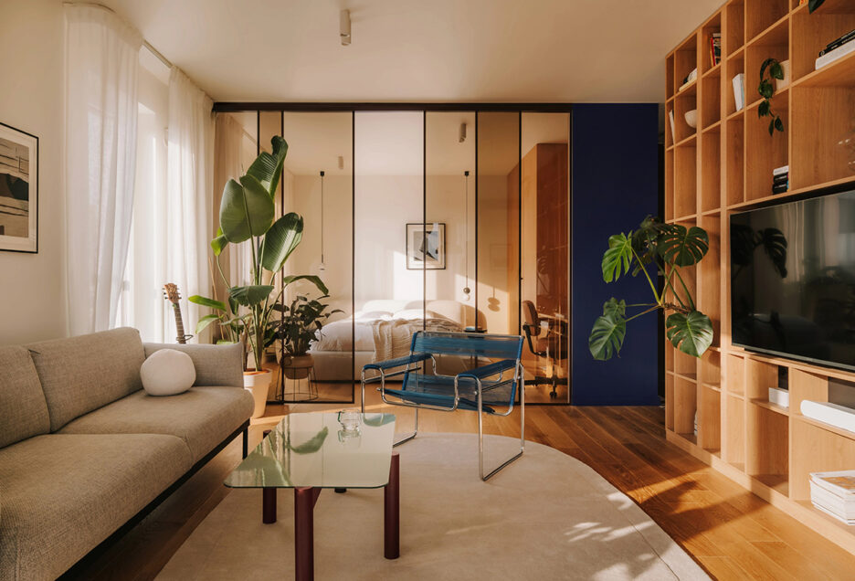 Эта квартира расположилась в одном из высотных домов Лодзя, поэтому с его окон открываются прекрасные виды на старую мануфактуру и другие достопримечательности города. Интерьер получился очень тёплым и приятным, современный декор здесь разбавлен ностальгическими нотками ретро и оригинальными решениями (такими, например, как мозаичная плитка на полу). Стильная стеклянная перегородка и воздушная кухня с синими акцентами стали главными фишками этого приятного дизайна. Enjoy!