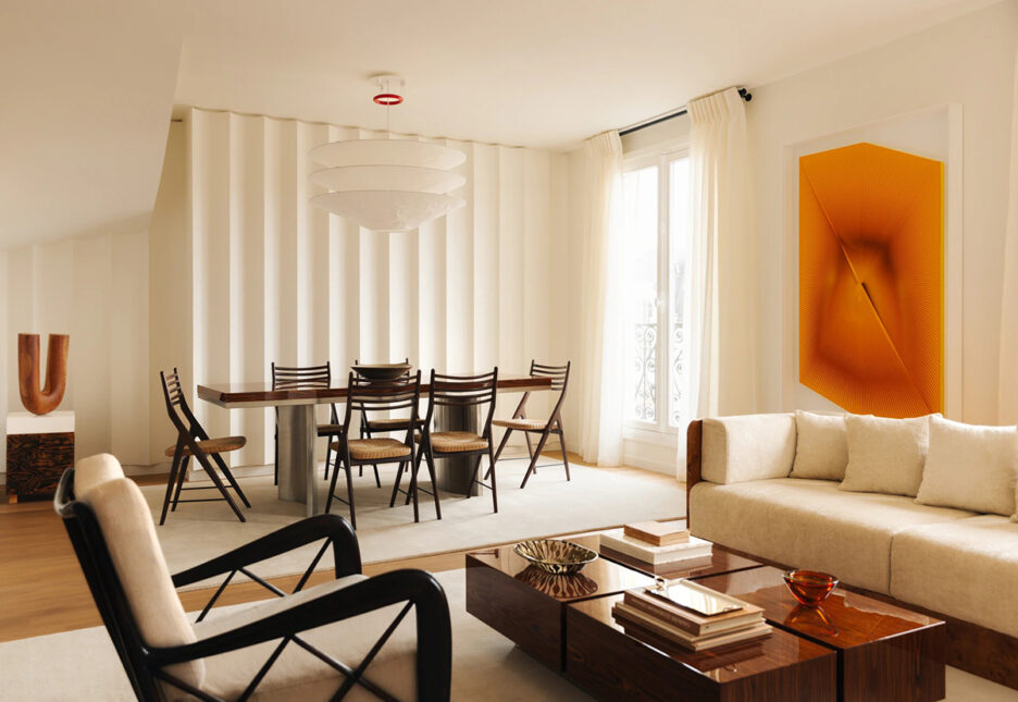 Французская студия Haddou Dufourcq недавно превратила заброшенный лофт художника на последнем этаже Османовского дома в Париже в необычное современное пространство с модной мебелью для молодой семьи. Волнистые настенные панели и современное искусство легли в основу обновлённого дизайна, в то время как приятная монохромная гамма из молочных оттенков создаёт эффект мягкости и нежности. Особенно хотелось выделить виды из окон квартиры: хозяева могут любоваться Эйфелевой башней в спальной, а также другие всемирно известными достопримечательностями из великолепной ванной комнаты. Enjoy!