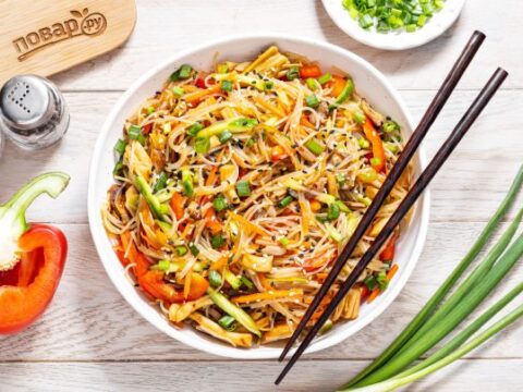 Фунчоза с вешенками и овощами