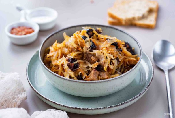 Готовый бигус с черносливом разложите по порционным тарелкам и подавайте к столу. Приятного аппетита!