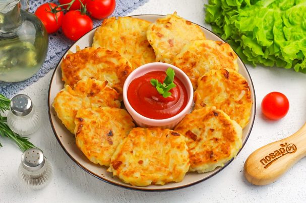 Подайте блюдо к столу с пылу, с жару вместе с соусом, кетчупом, сметаной и нарезкой свежих овощей, квашеными овощами. Приятного вам аппетита!