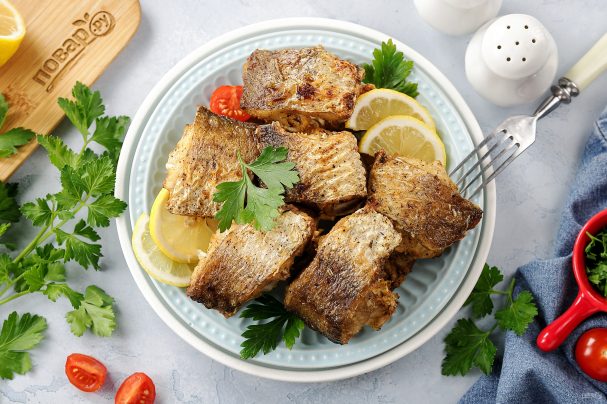 Хек в аэрогриле готов. Готовые стейки выложите на тарелку и сразу же подавайте к столу. Приятного аппетита!