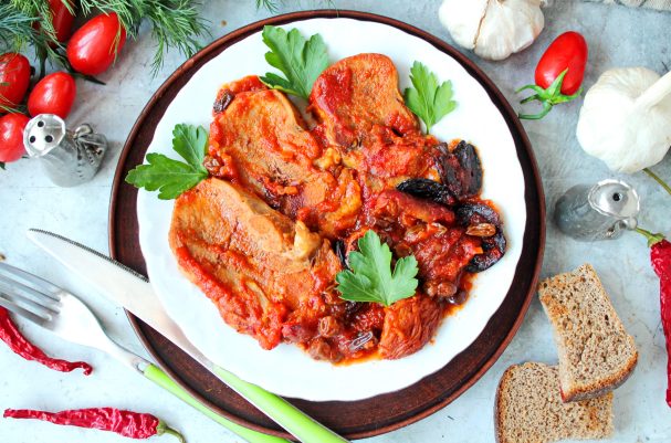 Говяжий язык лучше всего отварить заранее и оставить в холодильнике на несколько часов, положив в пакет. Так он будет лучше нарезаться и не крошиться. Сочетание сладких сухофруктов и кисленького томата придают блюду изысканный, кисло-сладкий, ни с чем несравнимый вкус. Подавайте блюдо на стол с овощами, отварным рисом или зеленой стручковой фасолью.