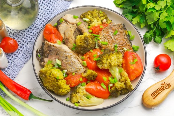 Добавьте в емкость нарезанные томаты и брокколи, посолите и поперчите все. Накройте емкость крышкой и томите на среднем нагреве примерно 15-20 минут. За это время овощи выпустят сок и кусочки рыбы потушатся, пропарятся.