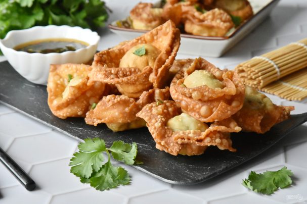 Вонтоны можно обжарить во фритюре и подать с соусом.