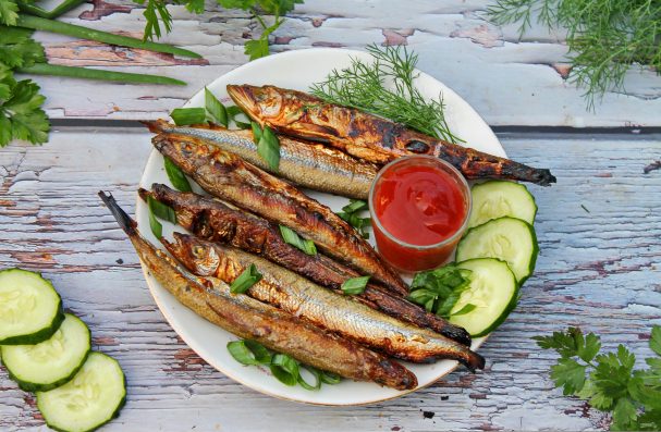 Корюшка приготовленная на мангале остается нежной и сочной. А еще она менее калорийна, чем жаренная в сковороде, так как в ней почти нет масла. Подавать ее лучше всего со свежими овощами, зеленью или просто с салатом из овощей. Так же отлично подойдет томатный соус или соус на основе йогурта с зеленью.