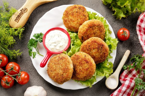 Куриные котлеты с хлебом готовы. Подавайте с соусами или с любимым гарниром. Приятного аппетита!