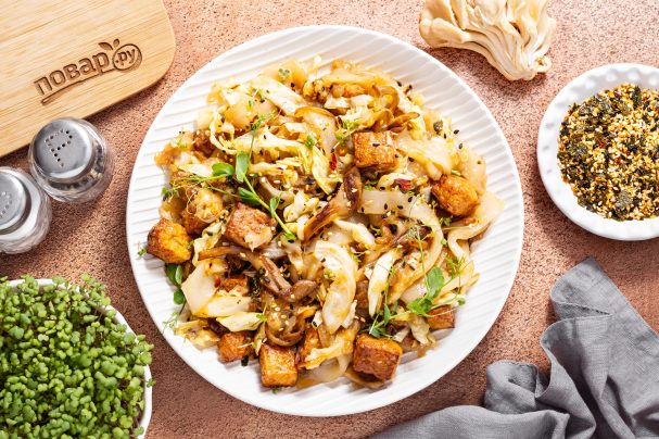 Ниже я расскажу подробнее, как приготовить лапшу из рисовой бумаги. Наполнение для лапши может быть любым. Вы можете заменить вешенки на шампиньоны или шиитаке, а вместо молодой капусты использовать пекинскую. Для вкуса также можно добавить мисо пасту или острую перечную пасту. Но предлагаю приготовить более полноценное блюдо и подать лапшу из рисовой бумаги с тофу, овощами и грибами. Получается такой простой, сытный и комфортный вариант еды для ужина или обеда.