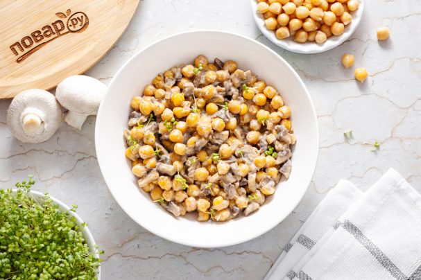 Ниже я расскажу подробнее, как приготовить нут с грибами в сливочном соусе. Если хотите сократить время готовки, то можно взять консервированный нут. Вместо шампиньонов можно использовать вешенки или сушеные лесные грибы, просто заранее их отварите. Такое блюдо можно подавать к макаронам, отварному картофелю или рису.