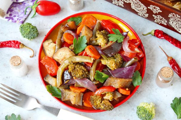 Переложите овощи в форму для запекания, влейте воду и закройте фольгой для запекания. Форму поставьте в горячую духовку и запекайте при температуре 180 градусов в течение 30 минут. Аккуратно перемешайте, уберите фольгу и запекайте еще 10 минут. Готовое овощное рагу с брокколи и баклажанами разложите и сразу подавайте к столу.