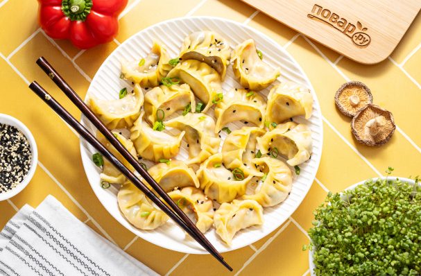 Ниже я расскажу подробнее, как приготовить овощные дамплинги. Шиитаке можно заменить на шампиньоны, а из овощей добавить цукини, зерна кукурузы или зеленый горошек. Дамплинги также можно просто отварить в горячей воде или приготовить на пару. Благодаря начинке блюдо получается сочным, пикантным и очень вкусным! Подать овощные дамплинги можно с кунжутным маслом и соевым соусом.