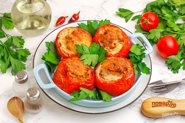 Запеченные помидоры с фаршем получаются сочными и аппетитными, главное — не слишком долго запекать их, чтобы они не потеряли свою форму. Можно в конце приготовления присыпать блюдо тертым сыром и запечь еще 3-4 минуты. За это время сыр расплавится и помидоры приобретут аппетитную сырную "шапочку". Добавляйте в фарш куриное яйцо — оно "скрепит" начинку и она не распадется на части. Можно дополнить фарш зеленью, нарезкой овощей, кислыми ягодами и т.д.