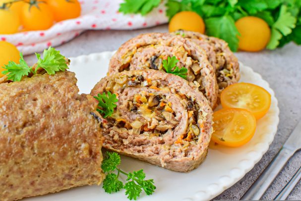 Остывший рулет можно порезать на кусочки и подать к столу в качестве закуски. А в горячем виде он станет прекрасным основным блюдом для любого застолья. Пропорции можно немного поменять или добавить в начинку что-то из овощей.