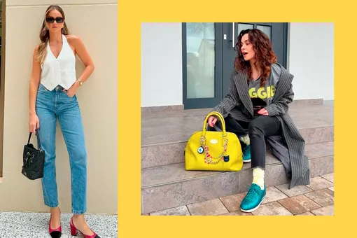 Вообще в 2025-м популярны удлиненные скинни. Но если ты собираешься достать из шкафа старые укороченные джинсы, их тоже можно реанимировать. Тут помогут высокие плотные носки (цветные) и кеды контрастного цвета.