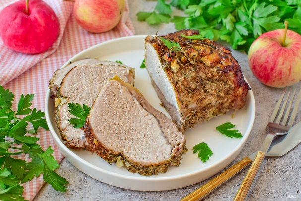 Запечь мясо можно в фольге, в пергаменте, в рукаве для запекания. Можно просто выложить его в жаропрочную форму и поставить в духовку, прикрыв фольгой. Несмотря на то, что яблоки теряют свой вид при запекании, но они успевают отдать свой аромат мясу.