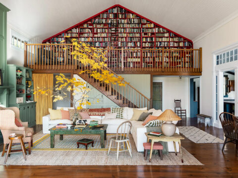 Роскошная библиотека в интерьере уютной дачи в штате Нью-Йорк