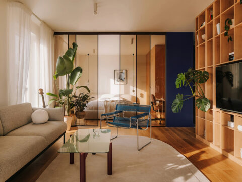 Тёплый современный интерьер со стеклянной перегородкой в Польше